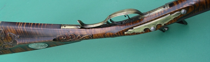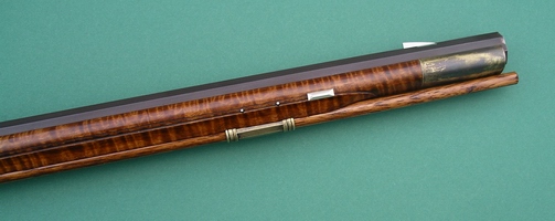 Getz swamped barrel, 40 cal., 7/8 in. at the breech, 43 in. long. As always, a handmade patchbox, sideplate cut and shaped from 1/8 in. sheet, sterling silver front sight made from folding sheet, braxzing into one piece and filing it up. Signed and dated. |