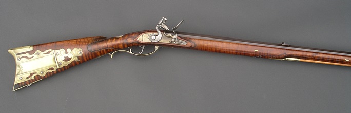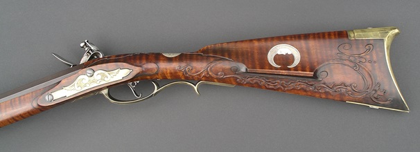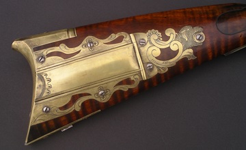 This rifle is in the style of York School gunmaker Adam Ernst. He used this "dog with a ball" theme on a number of his rifles. I have the head reversed with the dog looking down. |