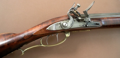The .54 cal. Getz Barrel is 42 inches long, 1 1/16 inches at the breech, 13/16 inches at the waist, and 7/8 at the muzzle, cut rifled with round bottom grooves. 3 pin retention along a simple raised forestock molding. The lock is a chambers golden age, highly tuned and finished inside and out, lightly casehardened, refinished bright and tarnished. A "white lightning" vent liner level with the top of the pan should give instant ignition. The stock is hard suger maple with perfect grain through the wrist and toe area. There is a moderate amount of figure throughout. A gun of this type would look as well with a dead plain stock or perhaps a subtle pinstripe. Vivid tiger stripe seems out of place here. The front sight is made from folding sterling silver sheet. Drawing silver solder into the seam makes it one piece for finishing. The rear sight is forged from steel sheet. The butt plate is 1 15/16 inches wide and 5 1/8 inches high. The rifle points beeautifully and despite the size of its components, has a very trim look. The length of pull is 13 3/4 inches. The rifle is in new, unfired condition, signed and dated. |