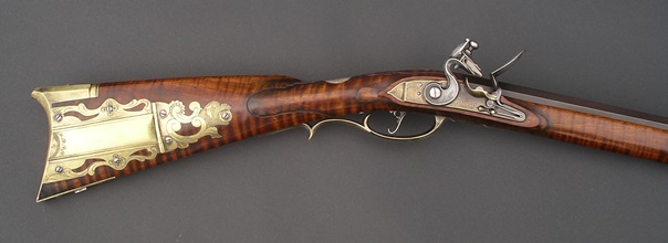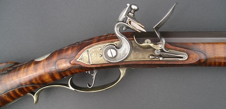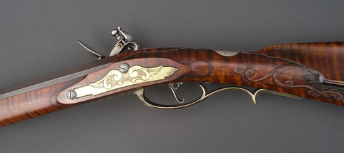 This rifle is in the style of York School gunmaker Adam Ernst. He used this "dog with a ball" theme on a number of his rifles. I have the head reversed with the dog looking down. |