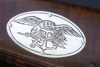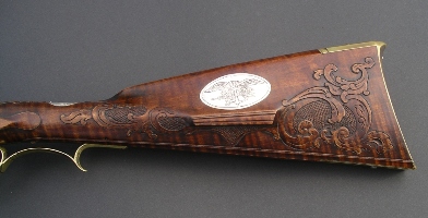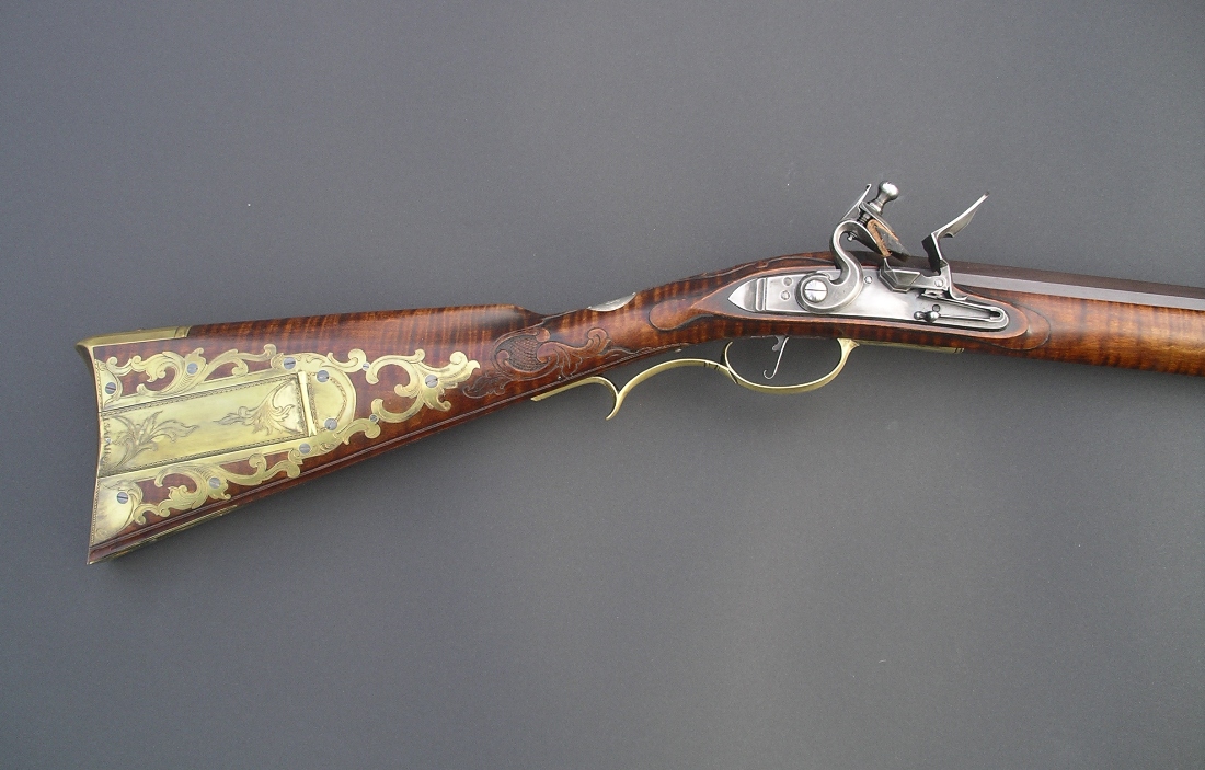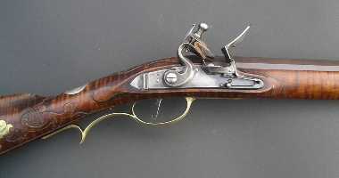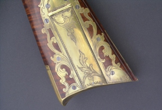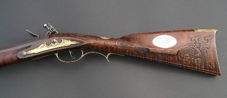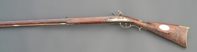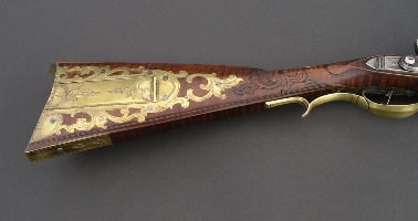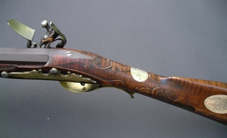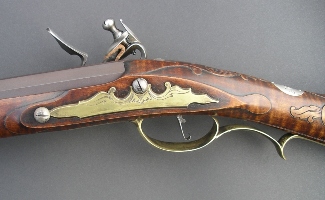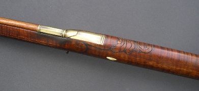 This rifle is the style of George Kreps of Hagerstown, Md. school of gunmaking about 1790-1800. The .50 cal. swamped Rice barrel is 44 inches long and 1 inch at the breech. The barrel is held by 4 steel wedges with brass heads. The lock is a Chambers' Golden Age, highly modified with a replacement hammer and top jaw. The release for the handmade patchbox is a button in the toe plate. |
