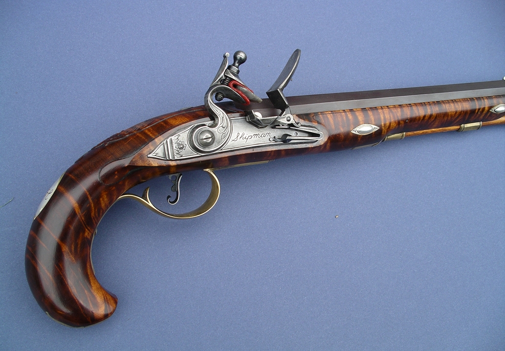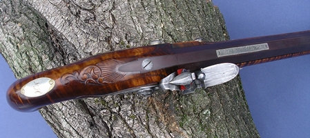 A pistol made in the Hagerstown School style. 10 in. Getz swamped barrel. Ditchburn pistol lock. |