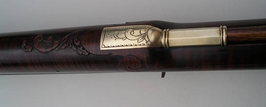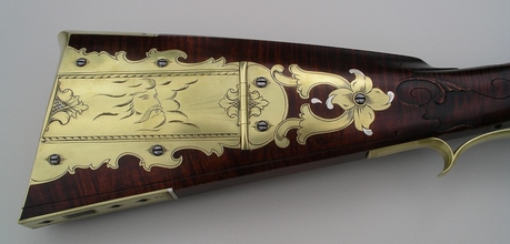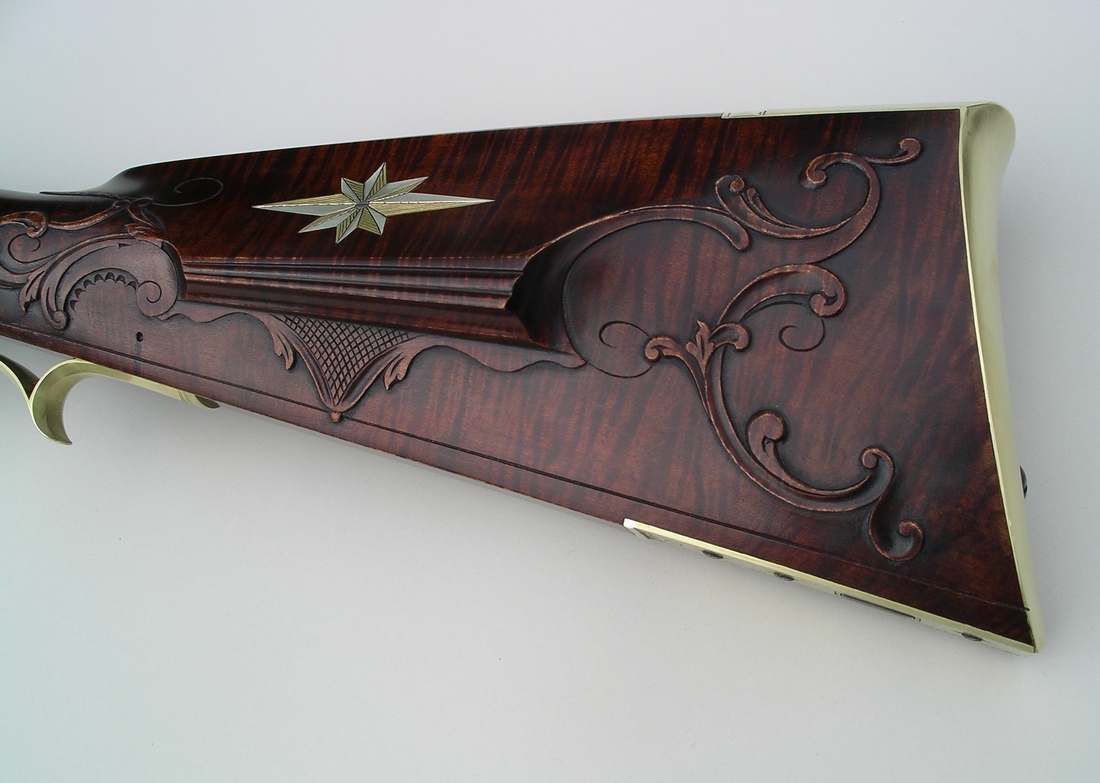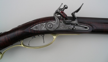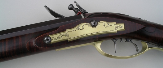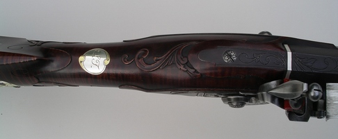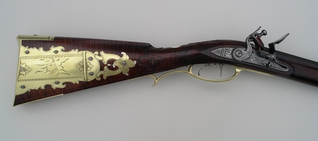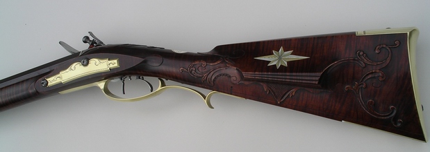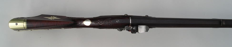 The patchbox on this rifle is a favorite with customers it seems. and I've used it a number of times. It's almost become a trademark. The style of the rifle is typical of the 1780's in Lancaster, but the use of sterling silver mixed with the brass marks it as contemporary. The petals of the patchbox pinwheel are tipped in silver, the silver wrist inlay has brass designs at the top and bottom, the cheekpiece star alternates brass and silver at each point, and there's a sterling silver band at the breech. The photos came out a little dark as far as the wood is concerned. Its darkly stained but not quite that much. Note the perfect grain, if you can, through the wrist and toe in the sugar maple stock. You can see a bit of cast off in the lower shot. The patchbox release is a wide square steel stud in the toe plate. The carving, on the cheekpiece side at least, is a takeoff of Isaac Haines, a Lancaster gunmaker of the period and one of the best guncarvers of the longrifle era. The front sight is made from folding sterling silver sheet then brazing it into one piece and filing to shape. My tired eyes love a sterling sight. A little nick at the sharp rear edge helps me find it perfectly in the dark woods or when the light is in my eyes, and it can be darkened with brass black if that's your desire for some conditions. German silver doesn't cut it. The barrel is a rice swamped 44" 50 cal. 1 1/16 in. at the breech. Signed and dated. |
