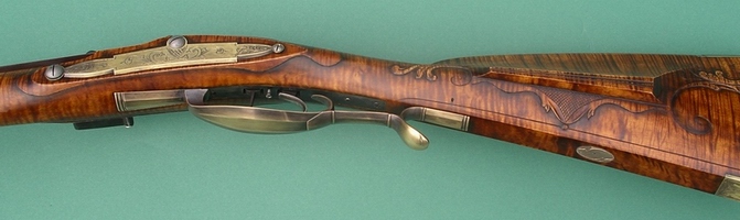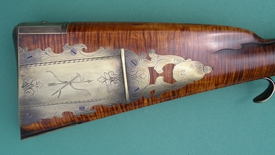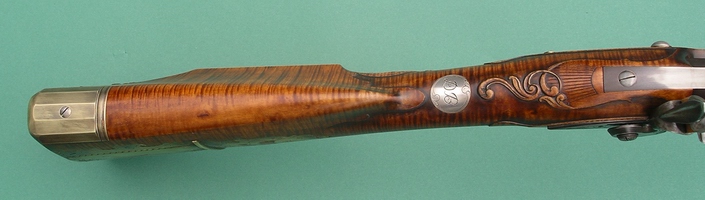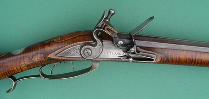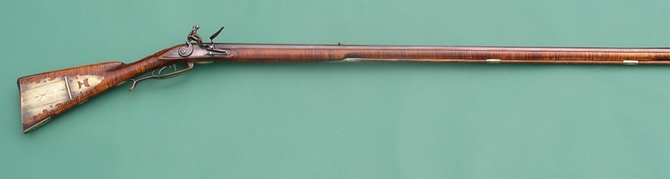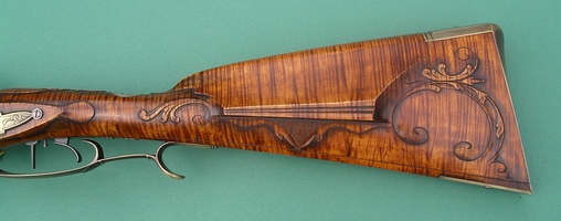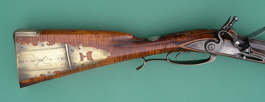 The gunmaker's conception of an early Virginia rifle. .50 cal. Rice barrel, 1 and 1/16 in. at the breech, swamped, 44 in. long. Hand made patchbox, sideplate, nose cap. Front sight made by folding and brazing sterling silver sheet. Perfect piece of sugar maple with grain parallel to the wrist and toe. |