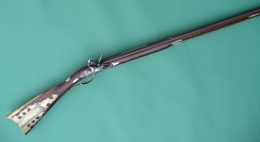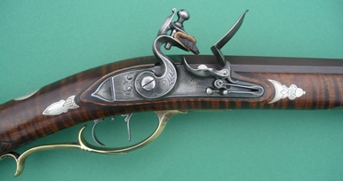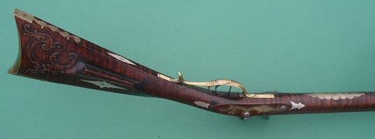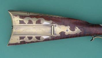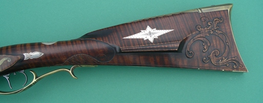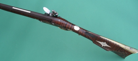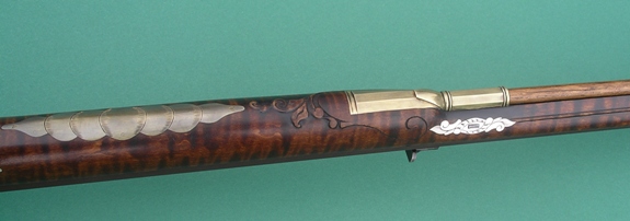This gun is made in the style of David Morton of Westmoreland Co. in western PA. Morton worked in the early 1800's. .45 cal. Rice barrel, 1 in. at the breech, tapered and flared, 44 in. long. The front sight and inlays are sterling silver and the upper panels of the patchbox sideplates are filled with silver. Signed and dated. |